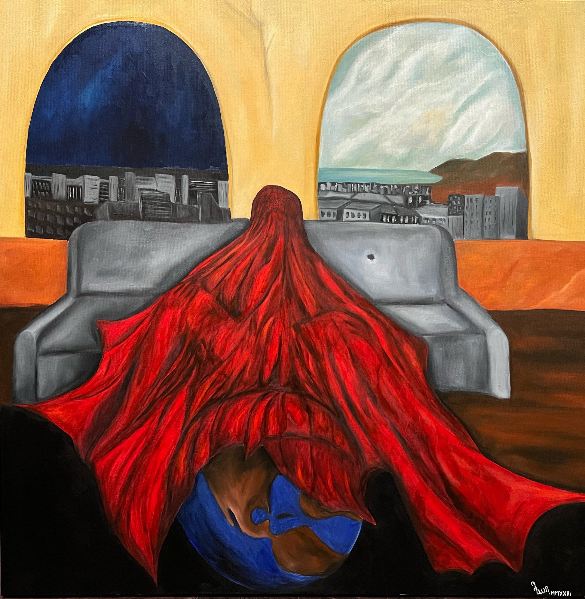 The draped figure appears to be seated on or rising from a globe, which seems to represent Earth. This imagery suggests a connection between the individual and the world, alluding to themes of environmental consciousness, global responsibility, or the weight of personal or collective burdens on a global scale. It might be implying that the figure, possibly a symbol of humanity, is intricately bound to or deeply affected by the state of the world.