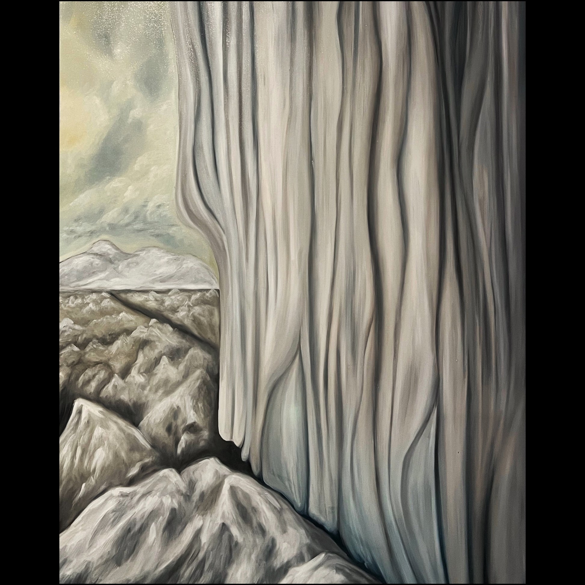 The painting as a whole could be a metaphor for the mind’s inner landscape, where clarity and obscurity coexist. The curtain or rock formation might represent the conscious mind’s surface, while the rough landscape symbolizes the subconscious or deeper truths lying beneath.
